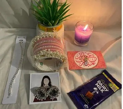• Material: Metal• Plating: Silver Plated• Stone: Pearl• Gender Type: Women• Stone Color: White• Product Design: Indian Design• Product Feature: Jewellery Deal, Unique Design, Product Packaging Type: Packed In A Box Including Bubble Wrap For Safety• Number Of Pieces: 4 Pcs• Size: 2, 2.5, 2.25• Color: Black, Blue, Maroon, Red, Pink, White• Package Includes: 2 x Kara Bangle, 12 x Plain Bangle• Size Dimensions: 7 Cm• cone mehndi and jhumki include• Note: Keep jewelry dry, away from chemicals. Store separately in a soft pouch. There might be a slight color difference due to different light and monitor effects.